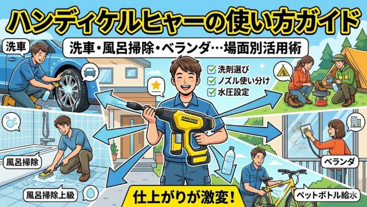 ガジェット ハンディケルヒャーの使い方ガイド|洗車・風呂掃除・ベランダ…場面別の活用術 ハンディケルヒャーはノズルと水圧の使い分けで仕上がりが激変。洗車・風呂掃除・ベランダ・自転車・キャンプなど場面別の最適設定と、洗剤選び・ペットボトル給水の実践テクニックを紹介します。 2026.03.19 ガジェット