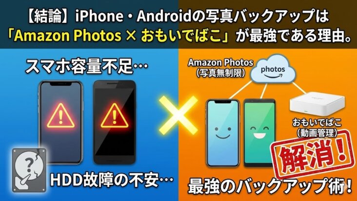 その他【結論】iPhone・Androidの写真バックアップは「Amazon Photos × おもいでばこ」が最強である理由。容量不足とHDD故障の不安を同時に解消!