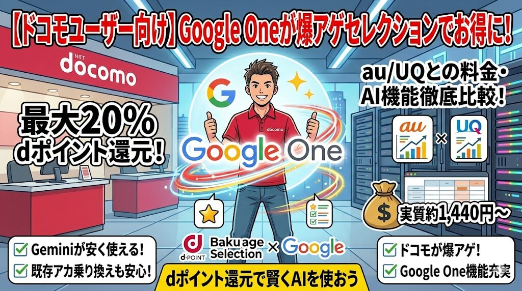 この記事では、ドコモユーザーがGoogle ONEをお得に契約する方法と、au/UQとの違い、そして既存契約からの乗り換え時にデータが消えない安心ポイントまで解説します。